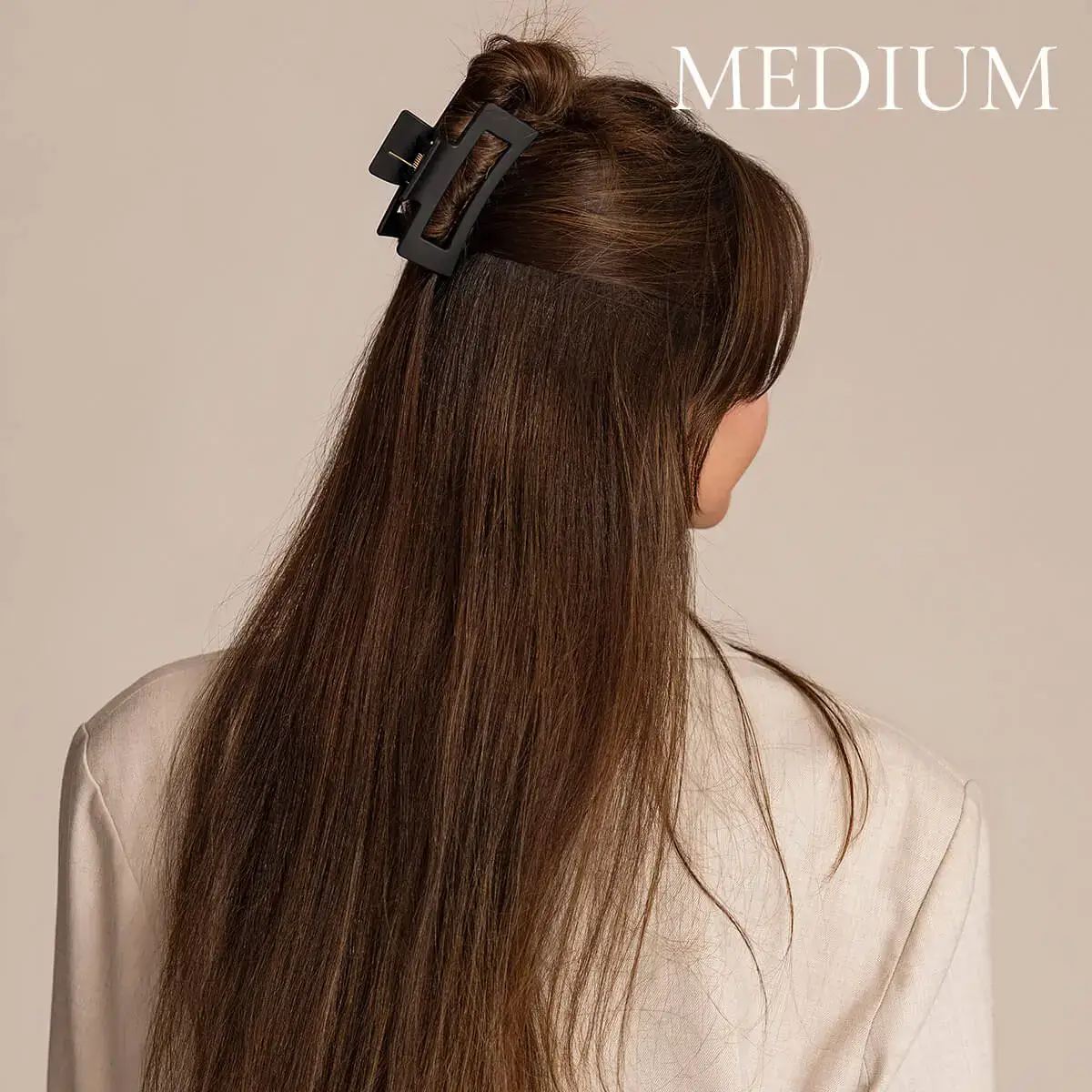 Unsere mittelgroße schwarze Haarklammer aus robustem Polycarbonat eignet sich perfekt für dich, wenn du dünnes bis dickes Haar hast und eine stilvolle Halbsteckfrisur möchtest. Wenn du dünnes oder kurzes Haar hast, eignet sich unsere mittelgroße Klammer auch perfekt für Vollfrisuren.